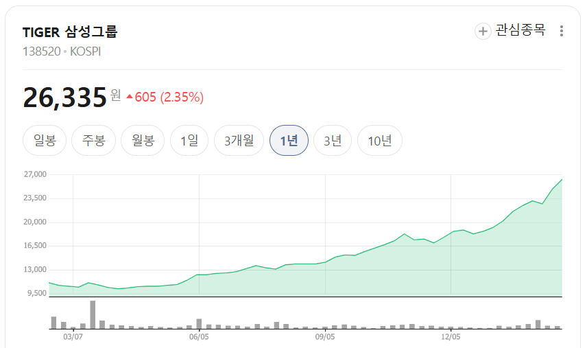 TIGER 삼성그룹 총보수는 연 0.15%로 KODEX 0.25%보다 저렴합니다. 장기 투자 시 비용 차이는 누적 수익률에 영향을 줄 수 있습니다.