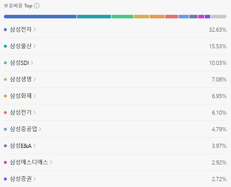 반면 KODEX 삼성그룹시가총액 중심 구조로, 삼성전자 및 대형주 비중이 자연스럽게 높게 형성됩니다.