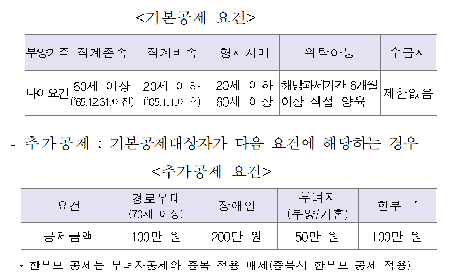 연말정산 피부양자 자격요건을 충족하면 기본공제와 추가공제를 통해 과세표준을 줄일 수 있습니다.