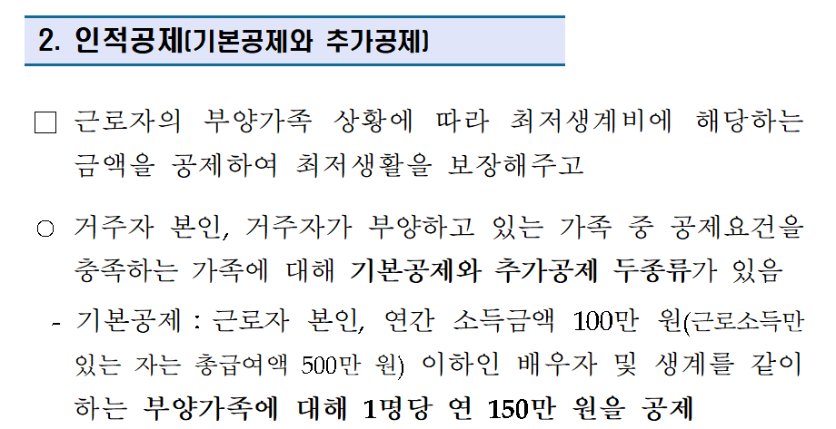 기본공제는 근로자 본인과 일정 요건을 충족한 부양가족 1인당 연 150만 원을 공제합니다.