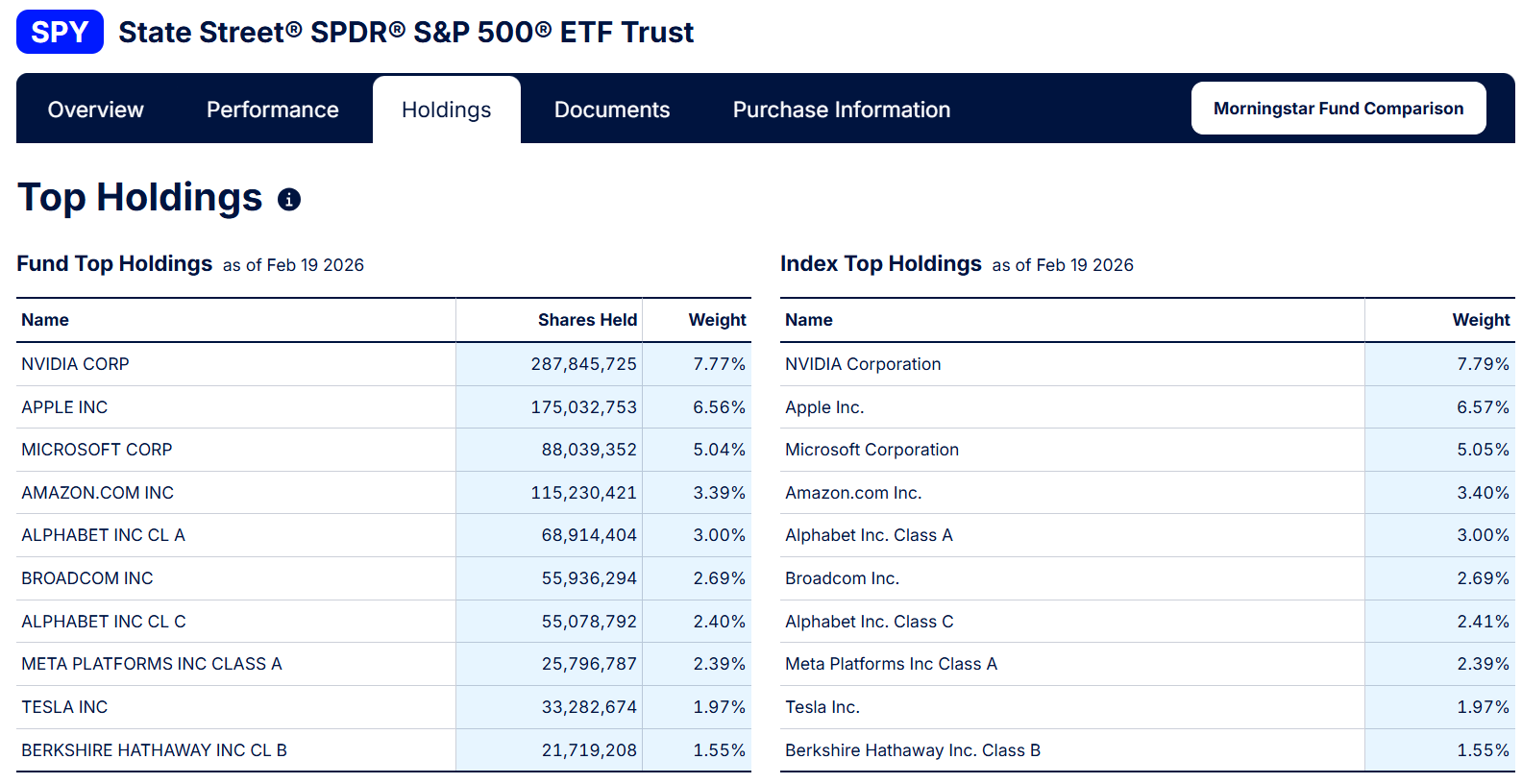 SPY ETF는 S&P 500 지수를 완전 복제(Full Replication) 방식으로 운용하며, 지수 구성 종목을 거의 동일 비중으로 보유합니다.